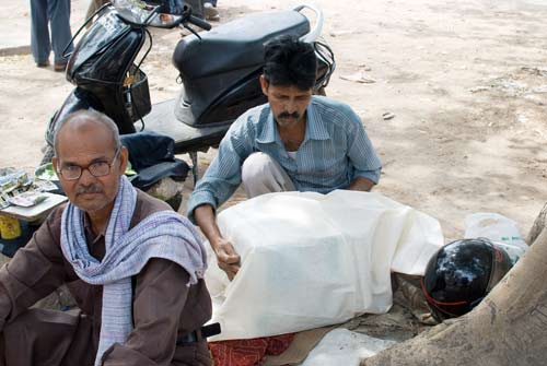 We spotted him near the trees with some men around him since he was selling paan, which he himself chewed continuously.