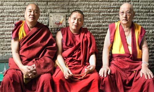 On the other side, a monk dressed in beautiful vermillion robes blessed people who came one by one to kneel in front of him. He placed a golden vessel on each person’s head, which we learned also contained some relics of the masters.