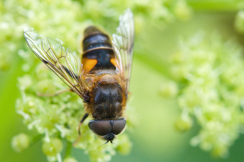 - Bees have four wings (while flies have two).